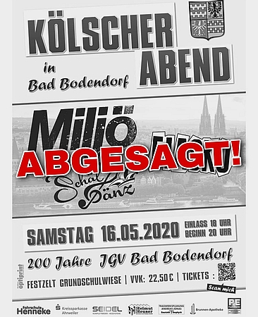 Somit findet auch der Kölscher Abend am Samstag, dem 16.05.2020, nicht statt!