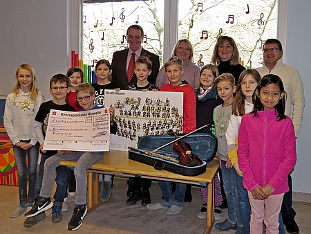 Die Übergabe der Spende fand schon im Februar statt, es war große Freude bei allen Beteiligten. Das Foto zeigt Hans-Otto Schade (Vorsitzender) und Karl Hanenberg (Schriftführer) zusammen mit Claudia Mercer (Schul-Leiterin) und Manuela Bauer (Musik-Lehrerin) mit einigen der Viertklässler.