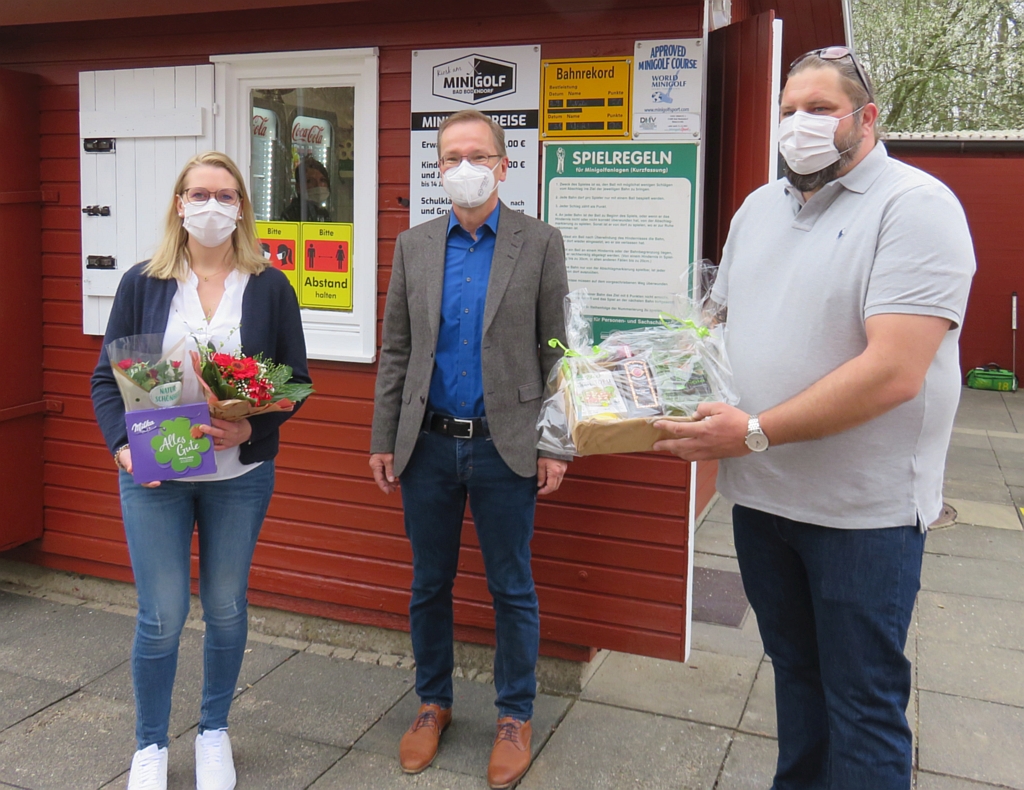 Bad Bodendorf. Fiel im vergangenen Jahr die offizielle Öffnung des Minigolfplatzes in Bad Bodendorf der Coronapandemie zum Opfer, konnte sie heute zur Freude des MGC unter den geltenden Hygienebestimmungen durchgeführt werden. Pünktlich um 11 Uhr am Karfreitag eröffnete die erste Vorsitzende Nicole Hansen im Beisein von Sinzigs Bürgermeister Andreas Geron, dem neuen Pächter Stephan Sieger und den Vereinsmitgliedern die Zeremonie mit einer kurzen Ansprache. Nach der Begrüßung des Sinziger Stadtoberhauptes, hieß sie den neuen Pächter und seine Lebensgefährtin Regina Vogel willkommen. Sie lobte ausdrücklich die hervorragenden Umbaumaßnahmen der Anlage, die Stephan Sieger bis dato in Absprache mit der Stadt und dem Verein durchgeführt hat. Im Anschluss bedankte sich Andreas Geron in einer kurzen Begrüßungsansprache bei dem Verein für die Einladung. Auch er hieß den neuen Pächter recht herzlich willkommen. Des weiteren hob er die Wichtigkeit des Platzes für den Tourismus und die Freizeitgestaltung in Sinzig und dem Kreis Ahrweiler hervor. Dabei bekräftigte er die Absicht, dass die Mittel für die noch dringend anstehenden Renovierungsarbeiten im nächsten Haushalt der Stadt berücksichtigt werden.